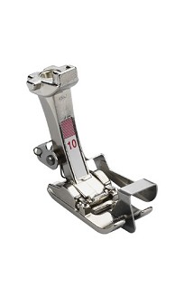 Der Schmalkantfuß #10 eignet sich zum schmalkantigen Absteppen sowie zum Absteppen mit der Zwillingsnadel. Er kann gut zum Verzieren und Verstärken von Säumen sowie zum Aufnähen von Taschen, Bändern und Spitzen eingesetzt werden; dies mit jeder Nadelposition.